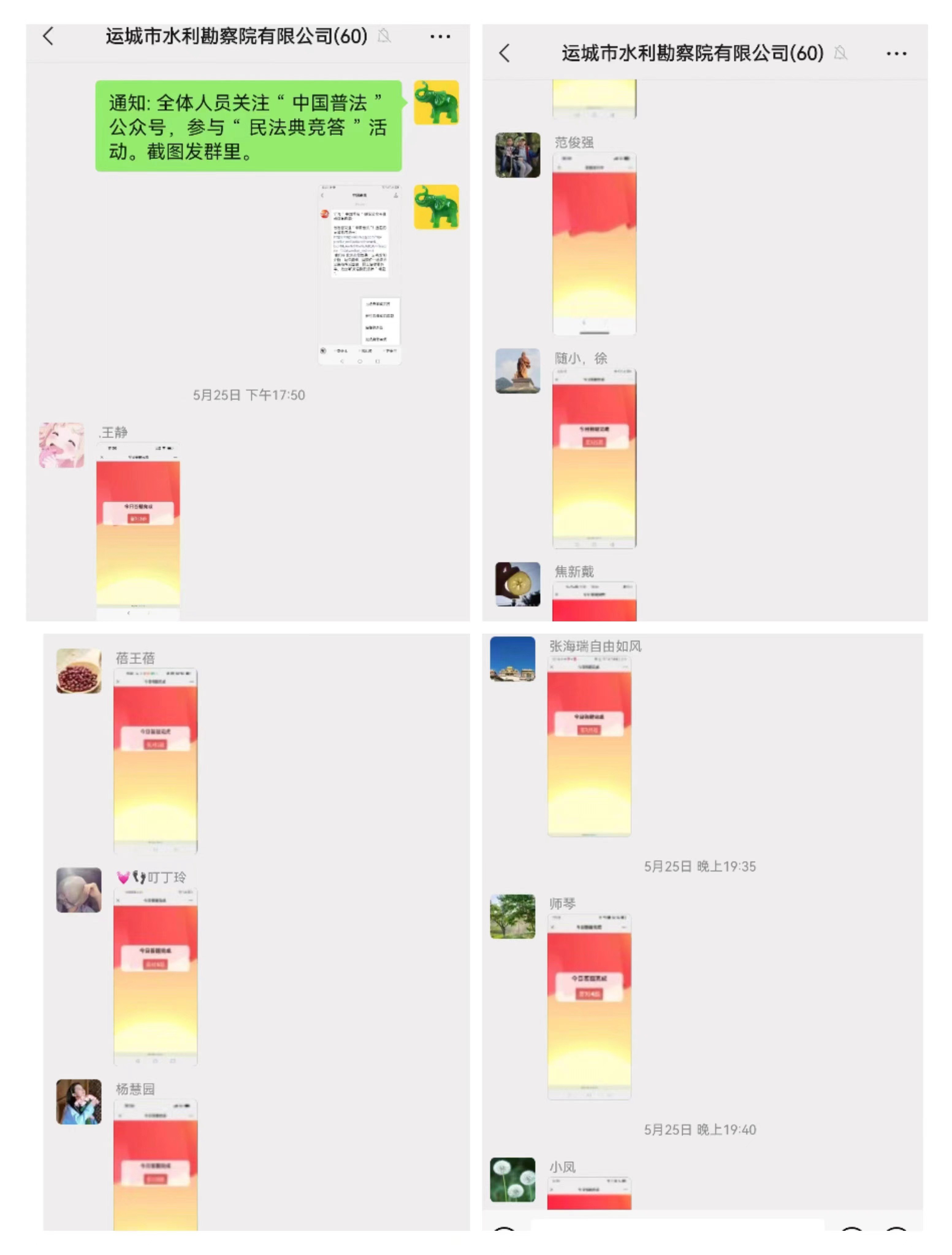 5月26日,公司組織全體干部職工參與《民法典》知識(shí)競(jìng)答活動(dòng),活動(dòng)以線上答題形式展開,通過關(guān)注并登錄“中國普法”微信公眾號(hào),在“齊參與”欄目中進(jìn)行。職工們積極踴躍,迅速掀起了答題熱潮,堅(jiān)持每日答題,在公司形成了學(xué)習(xí)法典、運(yùn)用法典、崇尚法典的良好氛圍。此次活動(dòng)的開展,讓全體干部職工切實(shí)意識(shí)到民法典在工作生活中保護(hù)自身合法權(quán)益方面的重要作用,進(jìn)一步提高了干部職工的學(xué)法氛圍和法治意識(shí),為建設(shè)團(tuán)結(jié)和諧、文明進(jìn)步的大美運(yùn)城提供了堅(jiān)強(qiáng)的法治保障。