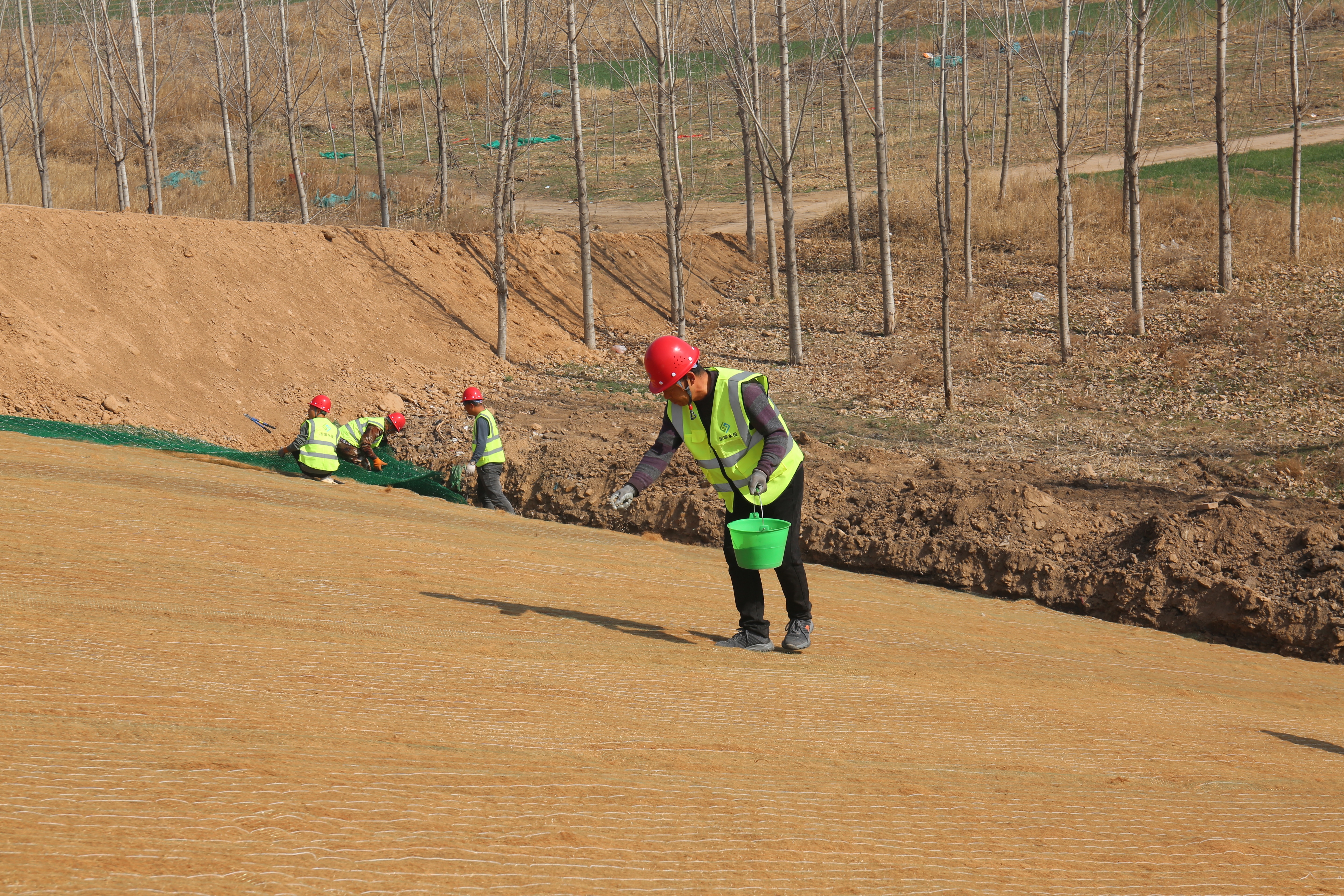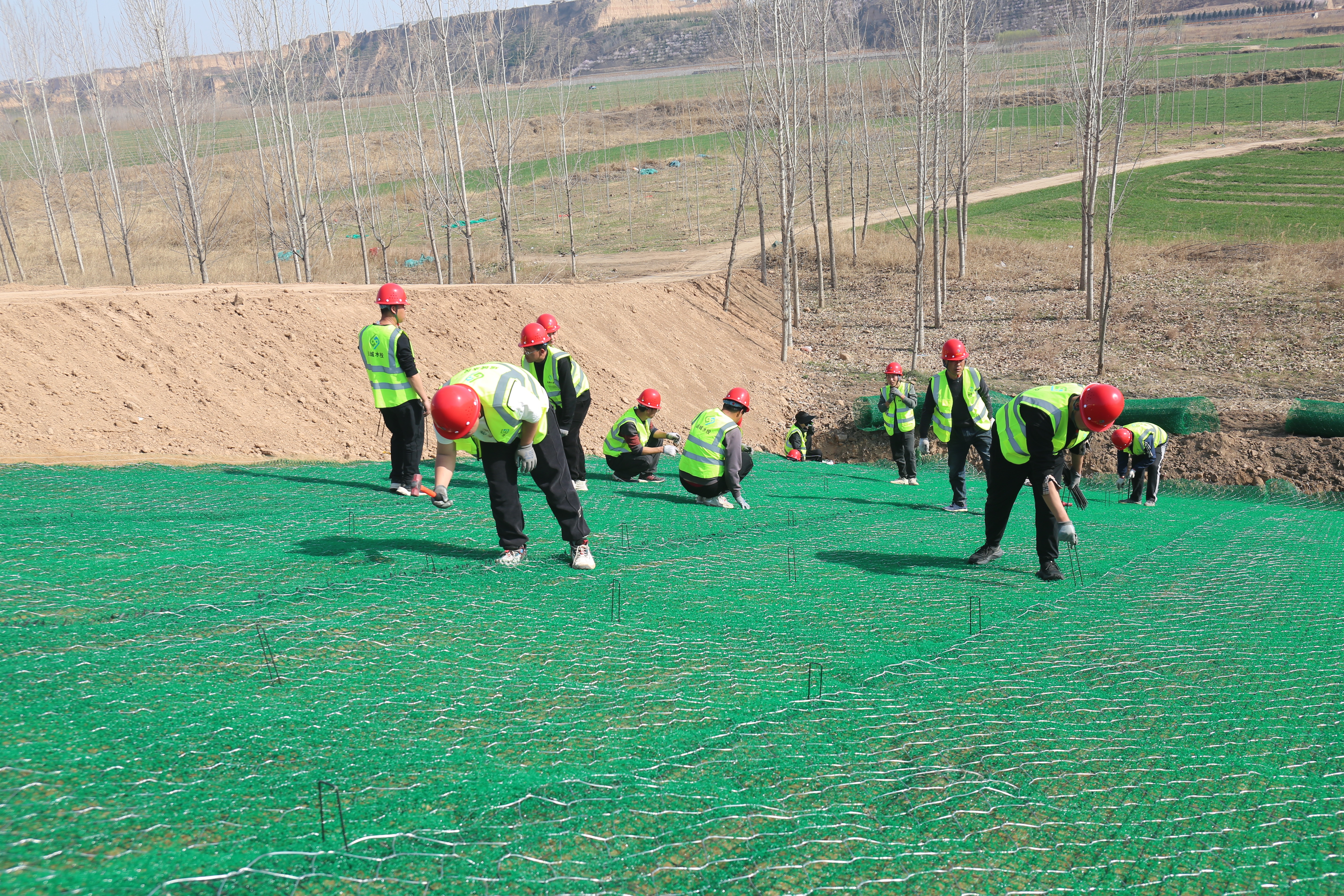 施工現(xiàn)場,工程機(jī)械、運(yùn)輸車輛、施工人員正在加緊作業(yè)。一片片椰絲毯經(jīng)過清除坡面雜物、坡度整修、開挖坑槽、播撒草籽等八道程序才能完好鋪設(shè)在大壩上。椰絲毯是一種新型環(huán)保材料,具有良好的吸水性、保濕性和透氣性,這種環(huán)保材料既可以起到穩(wěn)固河道邊坡、防止河岸沖刷破壞的作用,同時(shí)還能優(yōu)化生態(tài)環(huán)境。